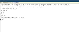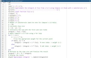 برای تقریب انتگرال یک تابع با روش سیمپسوت یک سوم در متلب به کد زیر توجه کنید: